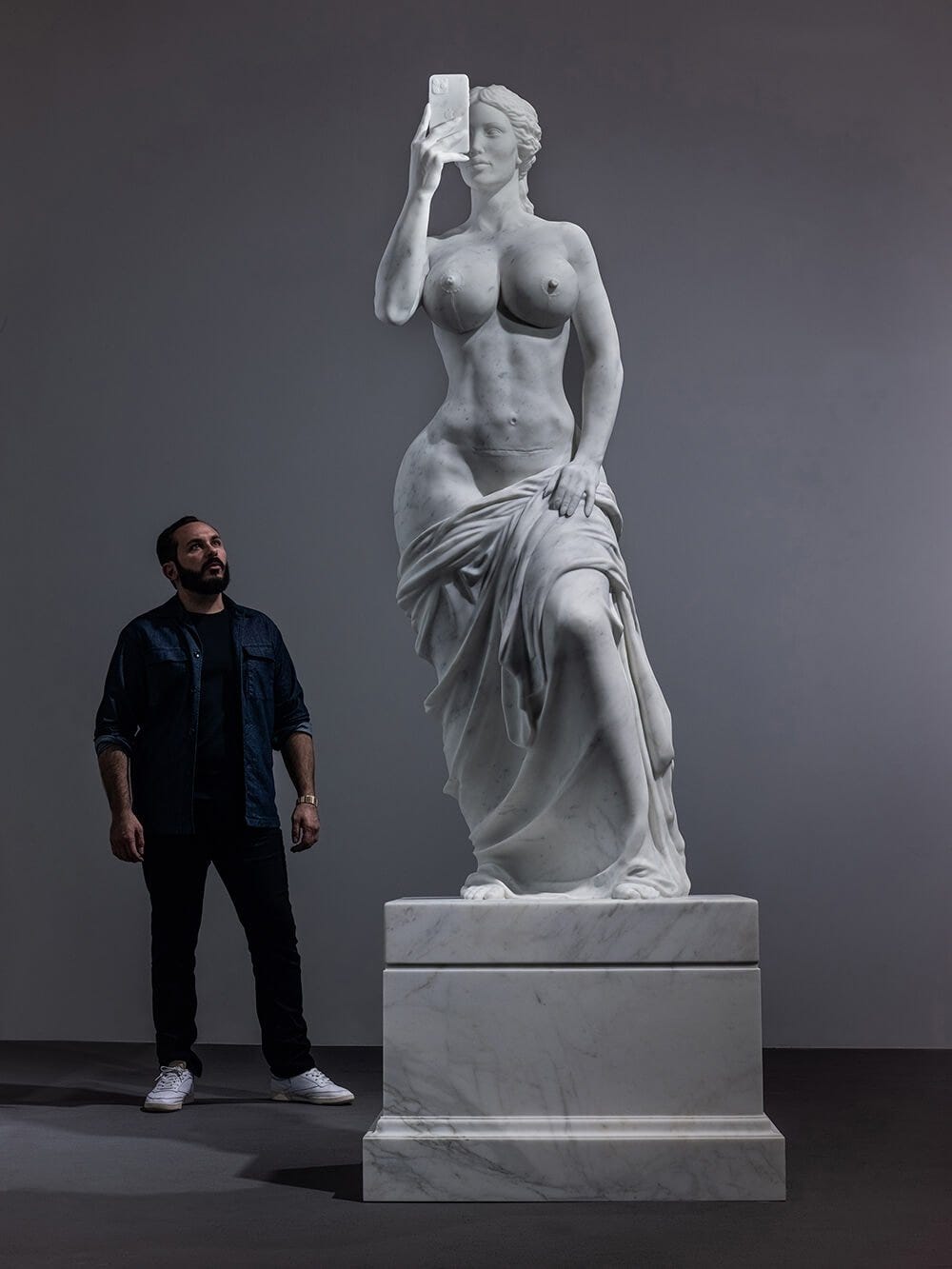 In a gallery corner, she stands frozen mid-pose, phone in hand, eternally chasing that perfect shot. No filter, no glow-up—just raw, scarred marble staring back at you. Meet Algorithmic Beauty, a 6’8” Statuario marble sculpture by Greg Lansky, completed in 2022.