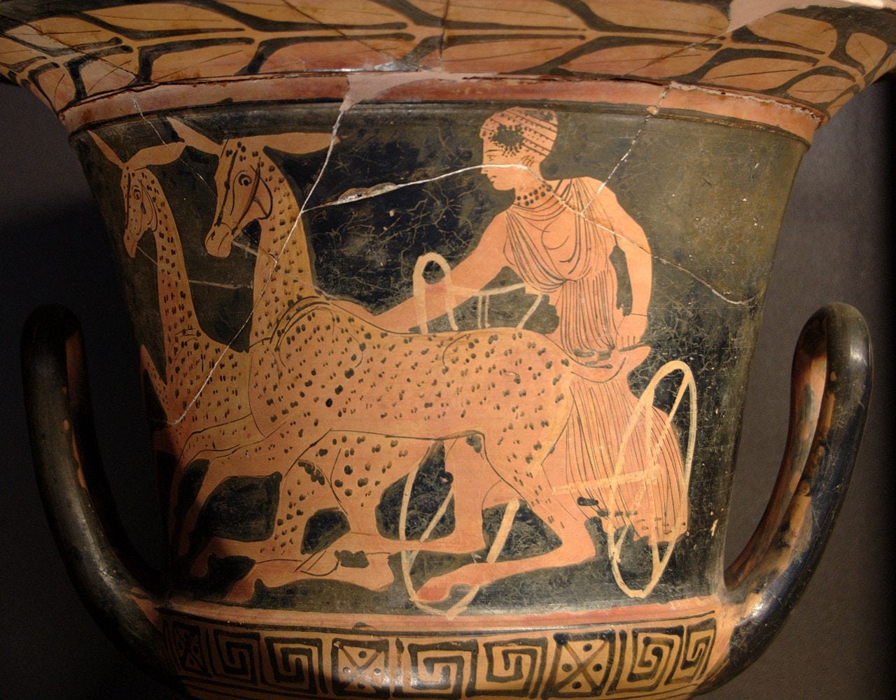 Artemis, goddess of the hunt, the moon, and untamed places, is the daughter of Zeus and Leto, twin of Apollo.